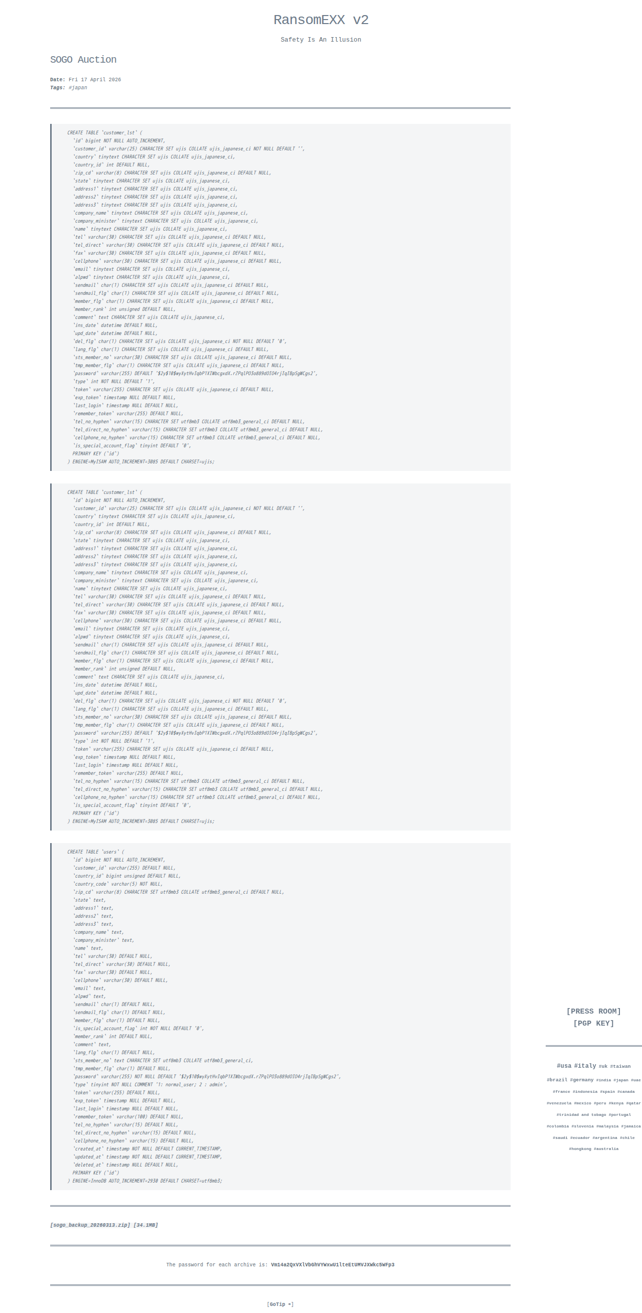 SOGO Auction - 951MB leaked. SOGO Auction is a prominent Japan-based, specialized auctioneer with over 30 years of experience in trading used construction machinery and heavy equipment. Operating since the 1990s, they provide both on-site and online, high-volume auctions for items like excavators and bulldozers. It is operated by SOGO Corporation.