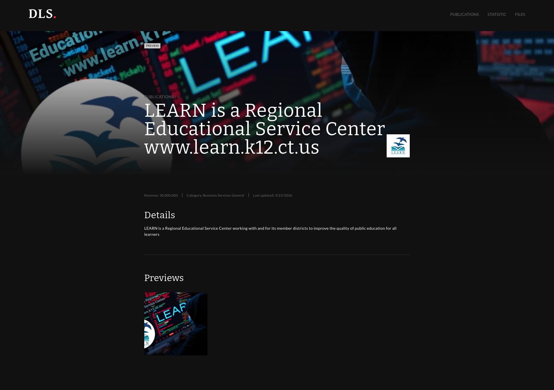 preview LEARN is a Regional Educational Service Center www.learn.k12.ct.us Revenue: 30,000,000 | Category: Business Services General LEARN is a Regional Educational Service Center working with and for its member districts to improve the quality of public education for all learners