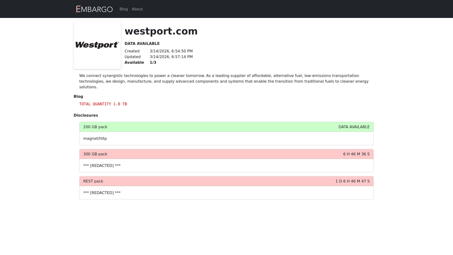 We connect synergistic technologies to power a cleaner tomorrow. As a leading supplier of affordable, alternative fuel, low-emissions transportation technologie... - TOTAL QUANTITY 1.8 TB
